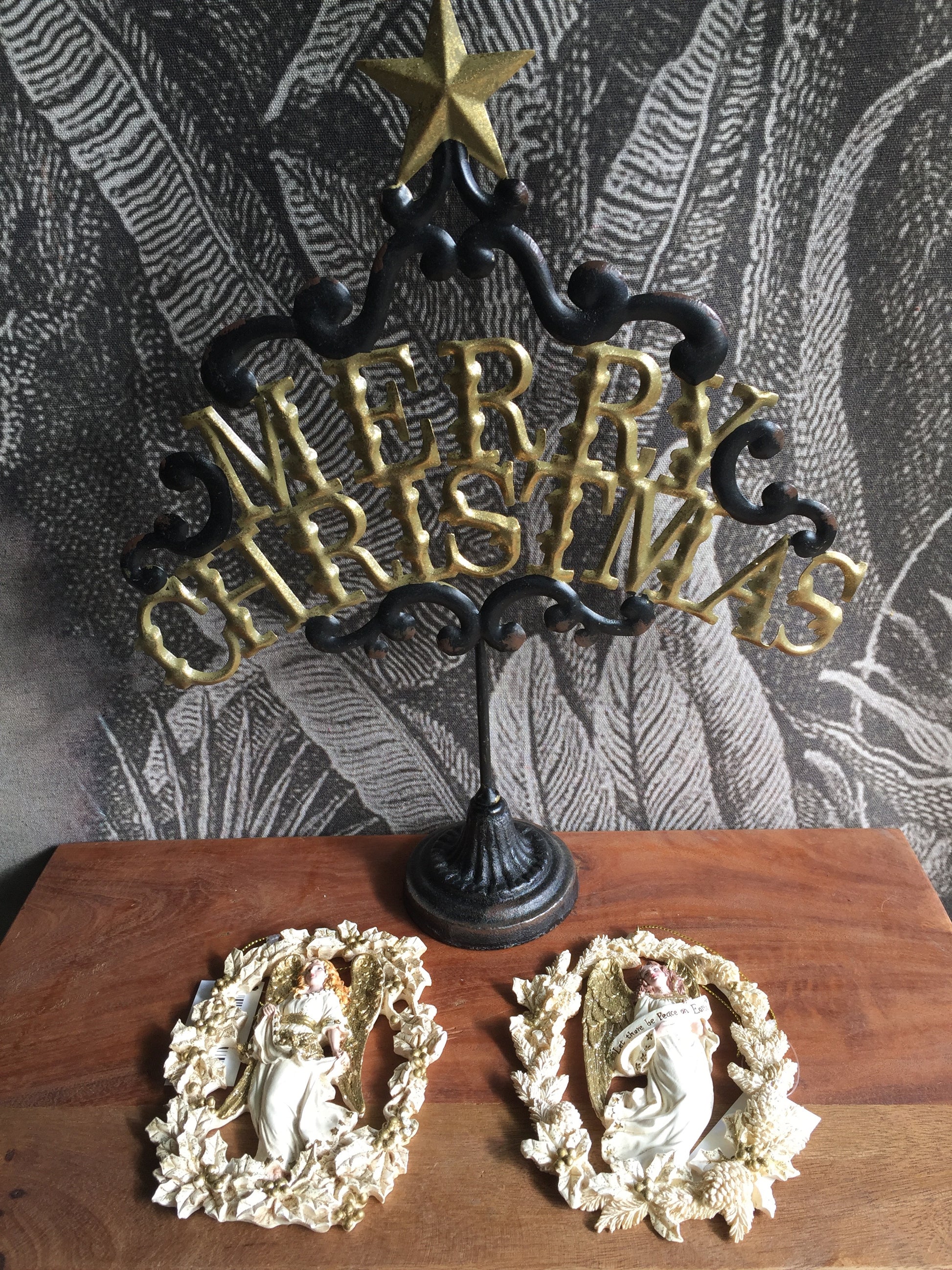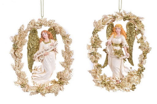 Lot de 2 suspension de Noël représentant un ange dans un cadre de feuille dorée.